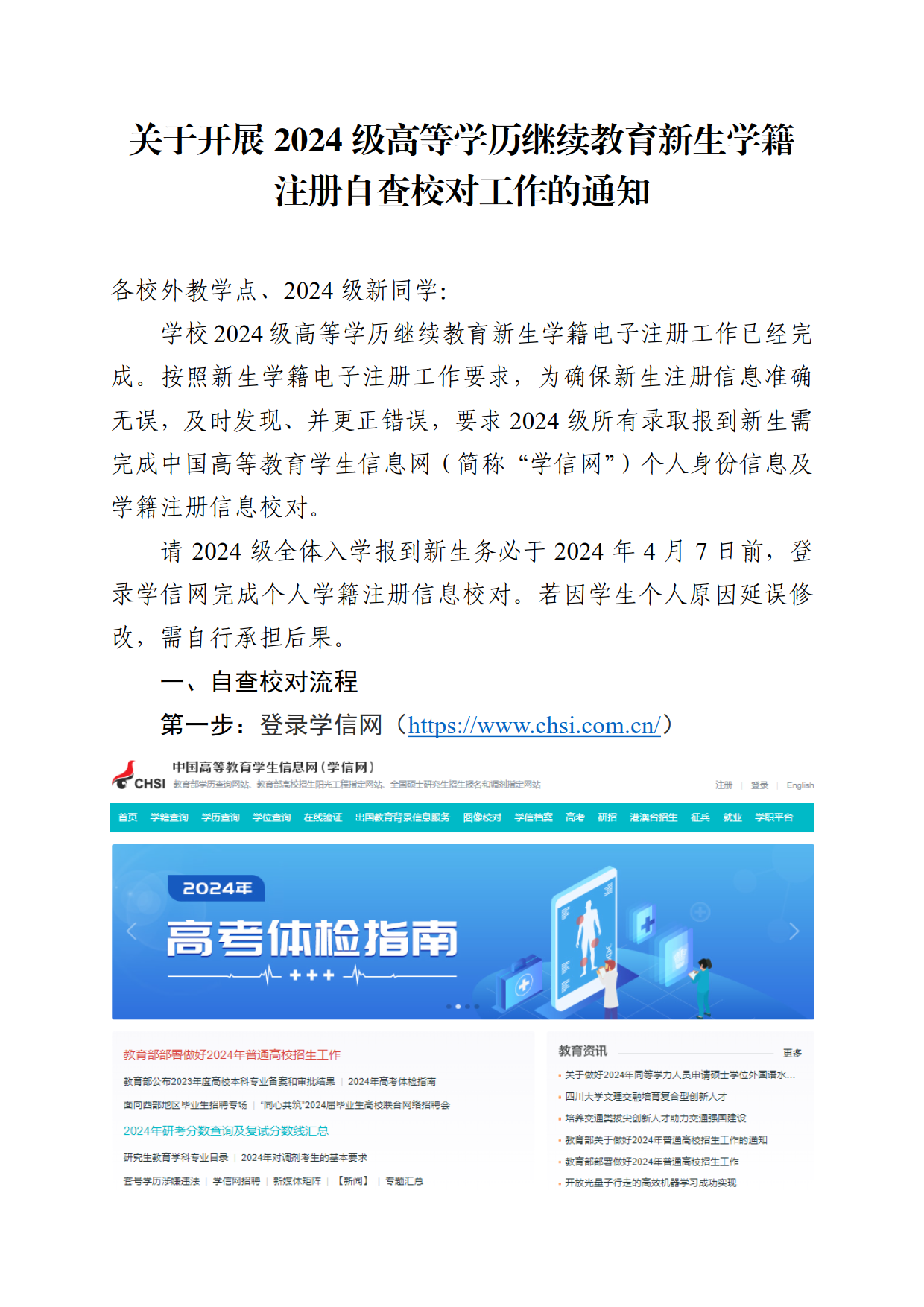 关于开展2024级高等学历继续教育新生学籍注册自查校对工作的通知